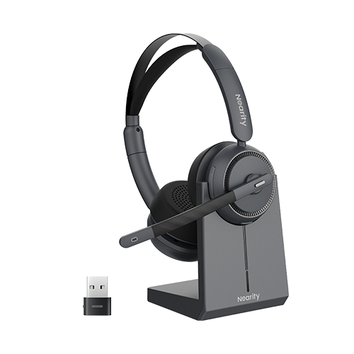 with dual-mic AI algorithm run on HiFi4 DSP, dongle for easy PC connection, 45H battery hour and charging stand.